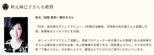 自身の描いた柔らかなイラストと共に、日本各地の美味しいものを紹介するその文章からは、「秋元康の妻」としてではなく、「一人の主婦」として家族の健康や団欒を大切にする温かい視点が伝わってきます。