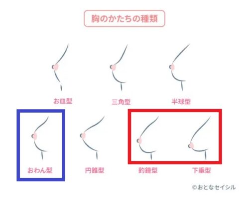 デビュー当初の波多野結衣さんのバストの形は赤枠で囲った垂れ気味のバストでした。(イラストほどには垂れていませんが)