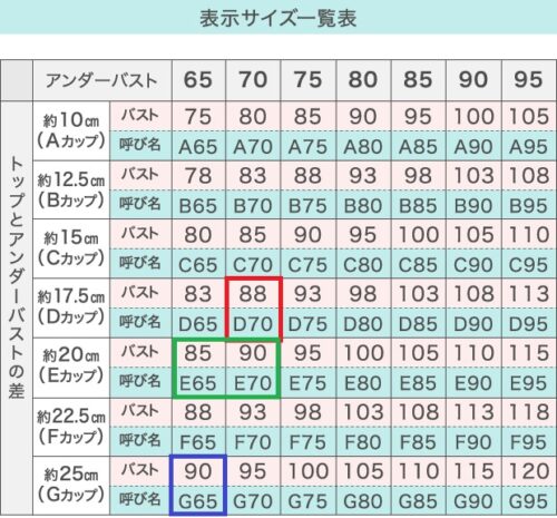 デビューから現在までトップバストの数値は変わらず88cmでカップサイズが年を追うごとに増大しているので、赤枠部分がデビュー当時のDカップ、緑枠がEカップ(Wikipedia掲載)、青枠が最新公式カップサイズ(事務所公表)となります。