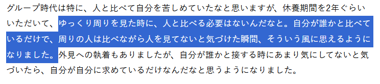 休養期間の2年半で人と比べる必要はないんだ!と気づくことによって自分の追い求める高い理想から解放されたともインタビューで話されています。