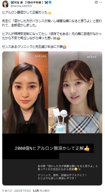 ヒアルロン酸溶解されてからの兒玉遥さんの心境はというと、今となっては「当時の写真を見ると変」だと感じているようで、整形依存も脱却されているんでしょうね。