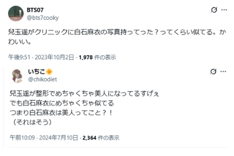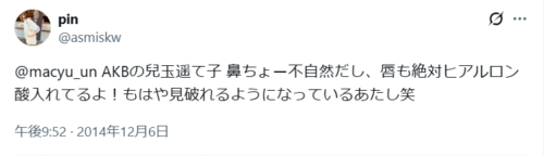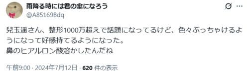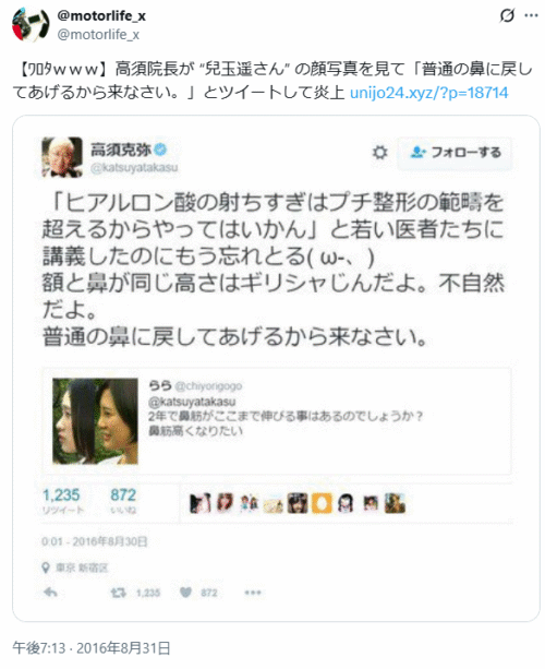 そんな中、2016年美容外科医の高須克弥先生が兒玉遥さんの鼻に関し「普通の鼻に戻してあげるから来なさい」と投稿され、炎上することもあったようです。(高須先生は兒玉さんだと知らずに投稿された可能性あり)