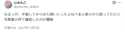 兒玉遥さんが2022年の写真集を出版した頃から豊胸を疑う方がでているようです。