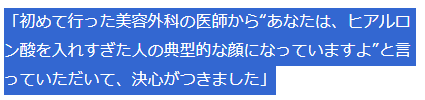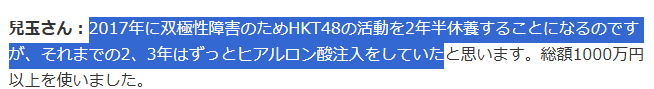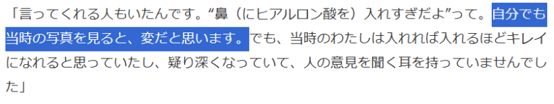 兒玉遥さんはヒアルロン酸施術をしていたことを公表していますが、同時にヒアルロン酸を打つことが精神安定剤になっていたことも公表しています。