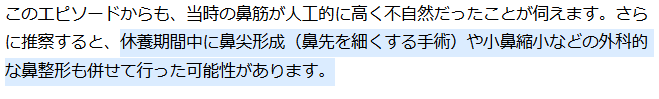- 〈目:埋没法〉〈鼻:鼻尖形成・小鼻縮小〉は専門医からも整形疑惑が指摘されている。