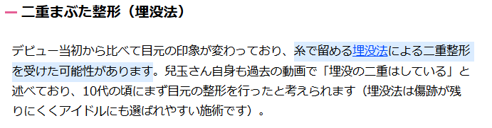 兒玉遥さんは二重術に関しては何も明かされていませんが、美容外科医からの見立てだと埋没法の可能性があるといった状況になっています。
