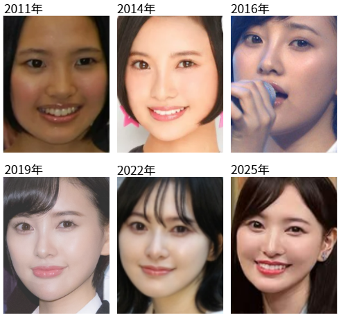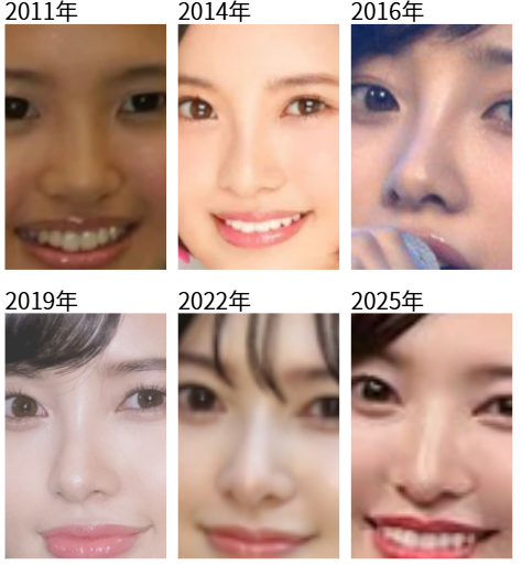2019年復帰された頃はまだ顎の尖りが気になりますが、2025年現在は自然な顎になっていますね。