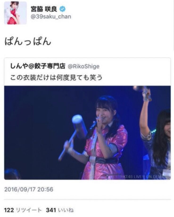 宮脇咲良さんのぱんぱん騒動は、一般人がアップした田島芽瑠さんの画像に対して「ぱんっぱん」と引用リツイートしてしまった誤爆によるものでした。