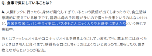 体を冷やさないことを心掛けていて、ジュースも氷抜きを飲まれているとの情報もあがっていますが、食べるものはオーガニックの食品にこだわるようにしているそうです。