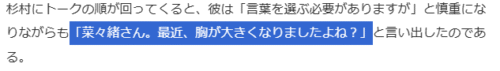 2012年テレビ番組『ダウンタウンDX』出演時、元衆議院議員の杉村太蔵さんから「菜々緒さん。最近、胸が大きくなりましたよね?」というド直球な質問をされました。