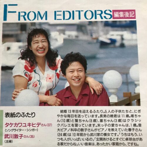 タケカワユキヒデさんと奥さんの武川敦子さんが並んだ貴重な写真。それは雑誌の「FROM EDITORS」欄で公開されたもので、当時の読者の間でも話題になりました。芸能人の夫婦写真というと演出されたイメージが強いものですが、この写真にはそうした“作り込み”は一切なく、自然体の二人が写っていました。